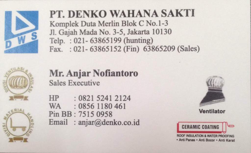 Bapak Anjar Nofiantoro (Anjar Denko) adalah marketing PT. Denko Wahana Sakti. Kami menjual Turbine (Roof Ventilator) dan berbagai alat Material Handling Seperti Pallet Mesh (Keranjang Besi), Hand Pallet, Hand Truck, Caster Wheel / Roda Trolley, Lift Table, Drum Handling, Drum Gripper, Drum Tripper, Stacker Manual/ Semi Electric dan Full Electric, Tangga Electric, Alumunium Platfrom, GTWY, JCPT, Scissor Lift dan Product Material Handling Lain nya. Untuk info penawaran dan lebih lanjutnya dapat menghubungi Hp: 082152412124, WA : 08561180461, BB : 75150958
