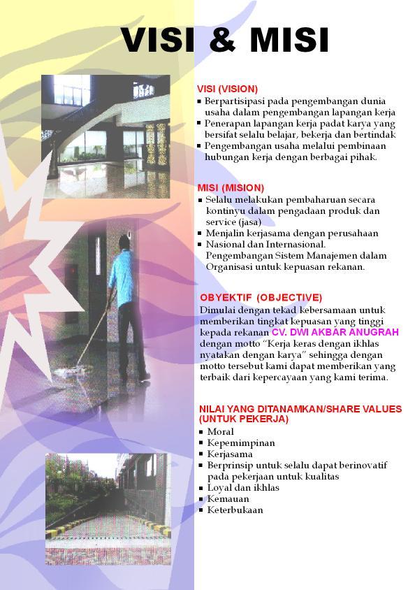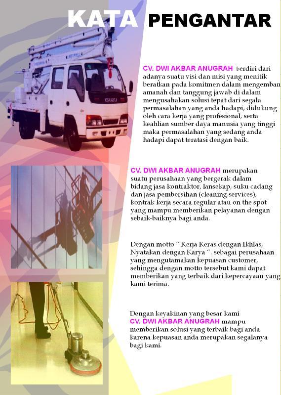 Salam Sejahtera semua,Kami,CV.DWIAKBAR ANUGRAH melayani semua Jasa Kebersihan( CLEANING SERVICE) Ektserior &Interior dan Landscaping,Untuk :Pehotelan,Perumahan, Rumah Sakit, Apartment,Kantor, Pabrik, Gudang, Gedung dll.undefinedundefined* Bidang Usaha Pembersihan1. Eksterior Bangunan* Kaca, Dinding* Keramik* Alucubon* Stainless Steel* Beton / Tembok* Pengecatan Gedung2. Interior Bangunan* Lantai Marmer* Lantai Granit* Lantai Keramik* Lantai Karpet* Counblock* Paving Block3. Perlengkapan Kantor* Komputer* Telephone* Exhaust* Unit AC* Sofa* Kursi Tamu4. Pertamanan ( Landscape)* Pembuatan Taman* Pembersihan Taman* Perawatan Taman5. General Cleaning* Untuk pembersihan interior dan eksterior bangunan yangbaru selesai dibangun ( Cleaning for Finishing)Kami menerima jasa kebersihan sesuai denganpermintaan anda seperti :General Cleaning / Pembersihan Umum seperti :- Kristalisasi / Pemolesan Marmer, Granit,Keramik, baik di lantai maupun dinding- Pencucian Sofa, Karpet ataupun Lantai Beton- Pencucian Kamar Mandi / ToiletundefinedundefinedKami menerima jasa lainseperti :- Pengadaan CleaningService Operator- Pembuatan Landscaping/Pertamanan-Pengadaanbarang dll.Daily Cleaning /Pembersihan Harian (dilakukan setiap hari) yang biasanya kami lakukan padaApartment, Spa, Kantor, Pabrik, dan Gedung.Kami juga menerima Home Cleaning untuk Rumahmaupun Apartment yang dapat kami kerjakan secara berkala sesuai denganpermintaan anda seperti :1X seminggu ataupun 2X semingguAnda tinggal menghubungi kami dan tim kamiakan datang ke tempat Anda untuk melakukan survey dan survey yang kami lakukanTIDAK dipungut biaya alias GRATIS:-)Layanan kami tersedia tujuh hari per mingguselama jam kantor yaitu pukul 08:00 s.d 17:00 WIB.Jadi, untuk info lebih lanjut silahkan menghubungikami di :Contact Person: 087775008533 ( alfi )Email: [email protected]