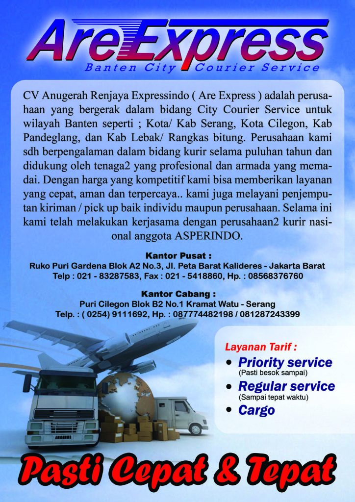 CV. Anugerah Renjaya Expressindo ( ARE Express ) adalah sebuah perusahaan jasa expedisi, cargo, trucking dan city courier wilayah banten yang melayani pengiriman berupa DOKUMEN, PAKET & CARGO. Yang mana CV. Anugerah Renjaya Expressindo ( Are Express ) memiliki beberapa segment bisnis expedisi & cargo, yakni : 1. Expedisi spesialis pengiriman dari jakarta ke wilayah banten ( serang, cilegon, pandeglang dan rangkas ) yaitu melayani kerjasama dengan perusahan expedisi dan cargo yang tidak mempunyai cabang di daerah provinsi banten untuk pengiriman express dan reguler berupa dokumen, paket dan juga cargo. 2. Expedisi & Cargo Banten melayani pengiriman barang berupa dokumen, paket, trucking dan cargo via darat, laut dan udara dari wilayah banten ( serang, cilegon, pandeglang dan rangkas ) ke seluruh wilayah indonesia ( domestic ). 3. Trucking 4. Pengiriman motor 5. Kerjasama kemitraan