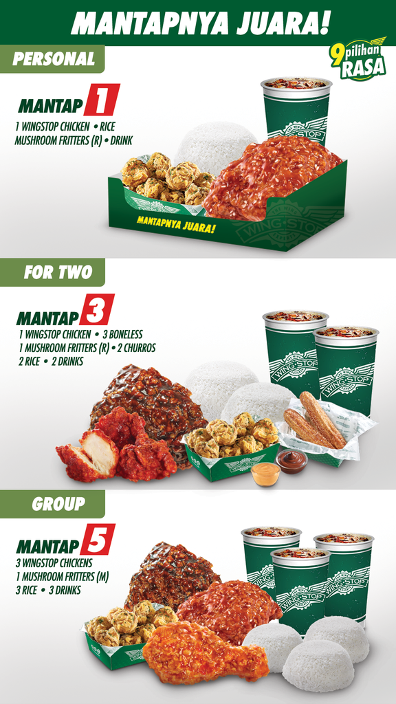 Wingstop sebagai JUARANYA RASA! para pelanggan bisa menikmati 9 Pilihan Rasa terbaik yang unik dan khas Wingstop. Tersedia menu dengan varian Wingstop Chicken, Crunchy Wings, Classic Wings dan Boneless. Wingstop juga menawarkan menu pelengkap seperti Skin-on Fries, Mushroom Fritters, Sweet Churros serta berbagai hidangan lainnya.