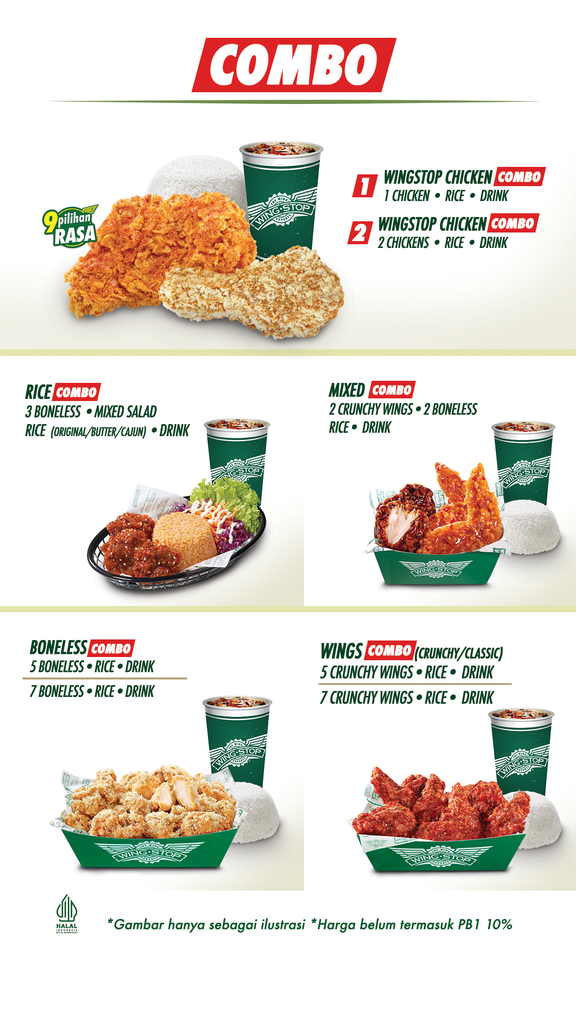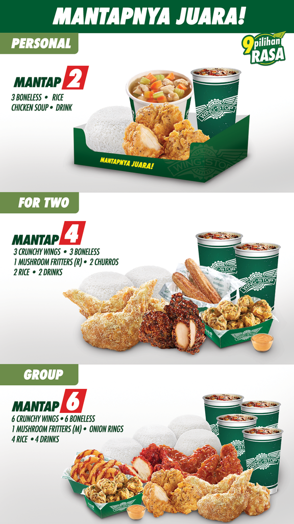 Wingstop sebagai JUARANYA RASA! para pelanggan bisa menikmati 9 Pilihan Rasa terbaik yang unik dan khas Wingstop. Tersedia menu dengan varian Wingstop Chicken, Crunchy Wings, Classic Wings dan Boneless. Wingstop juga menawarkan menu pelengkap seperti Skin-on Fries, Mushroom Fritters, Sweet Churros serta berbagai hidangan lainnya.